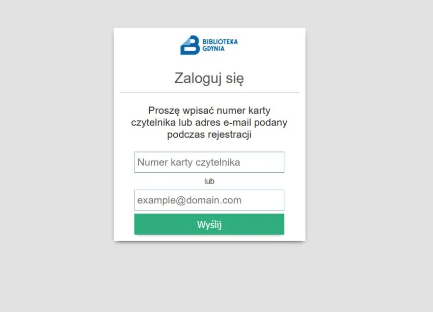Krok 4. Zostaniesz przekierowany na nową stronę (nie zamykaj poprzedniej). Na nowej stronie zostaniesz poproszony o podanie numeru karty bibliotecznej LUB adresu e-mail podanego w bibliotece podczas zapisu (przy podaniu obu proces nadania nowego hasła się nie powiedzie).