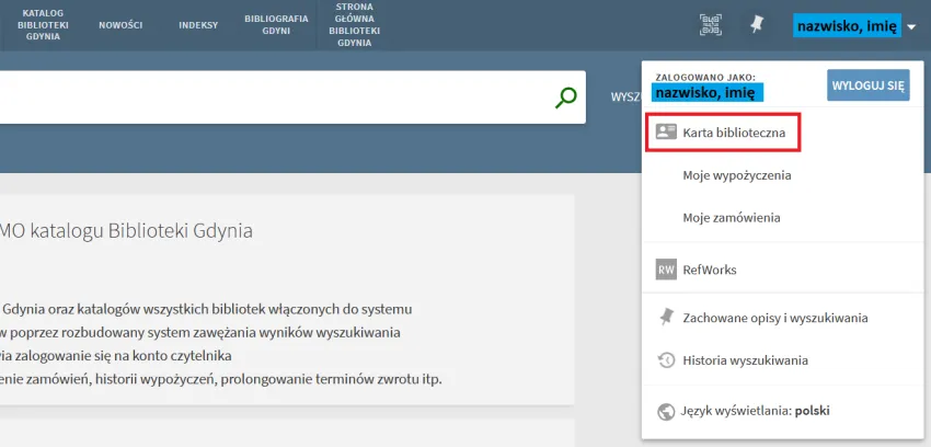 Po zalogowaniu w prawym górnym rogu pojawi się nazwisko i imię posiadacza konta. Po jego kliknięciu rozwinie się panel czytelnika, na którym należy wybrać KARTĘ BIBLIOTECZNĄ, gdzie znajdują się wszystkie najpotrzebniejsze informacje.