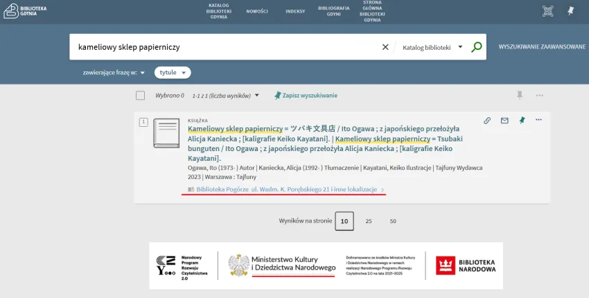 Na przykładowej ilustracji poniżej Kameliowy sklep papierniczy dostępny do wypożyczenia jest wyłącznie w Bibliotece Pogórze, a zamówić ją można w sześciu innych filiach naszej biblioteki. Uwaga! Każda osoba zapisana do Biblioteki może rezerwować materiały we wszystkich filiach bez konieczności wcześniejszego odwiedzenia ich.