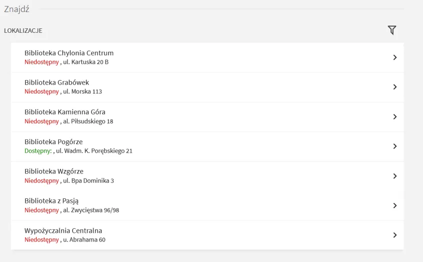 Krok 5. Po kliknięciu lokalizacji podejrzysz, w jakich bibliotekach książka jest dostępna do wypożyczenia, a gdzie można ją zamówić.